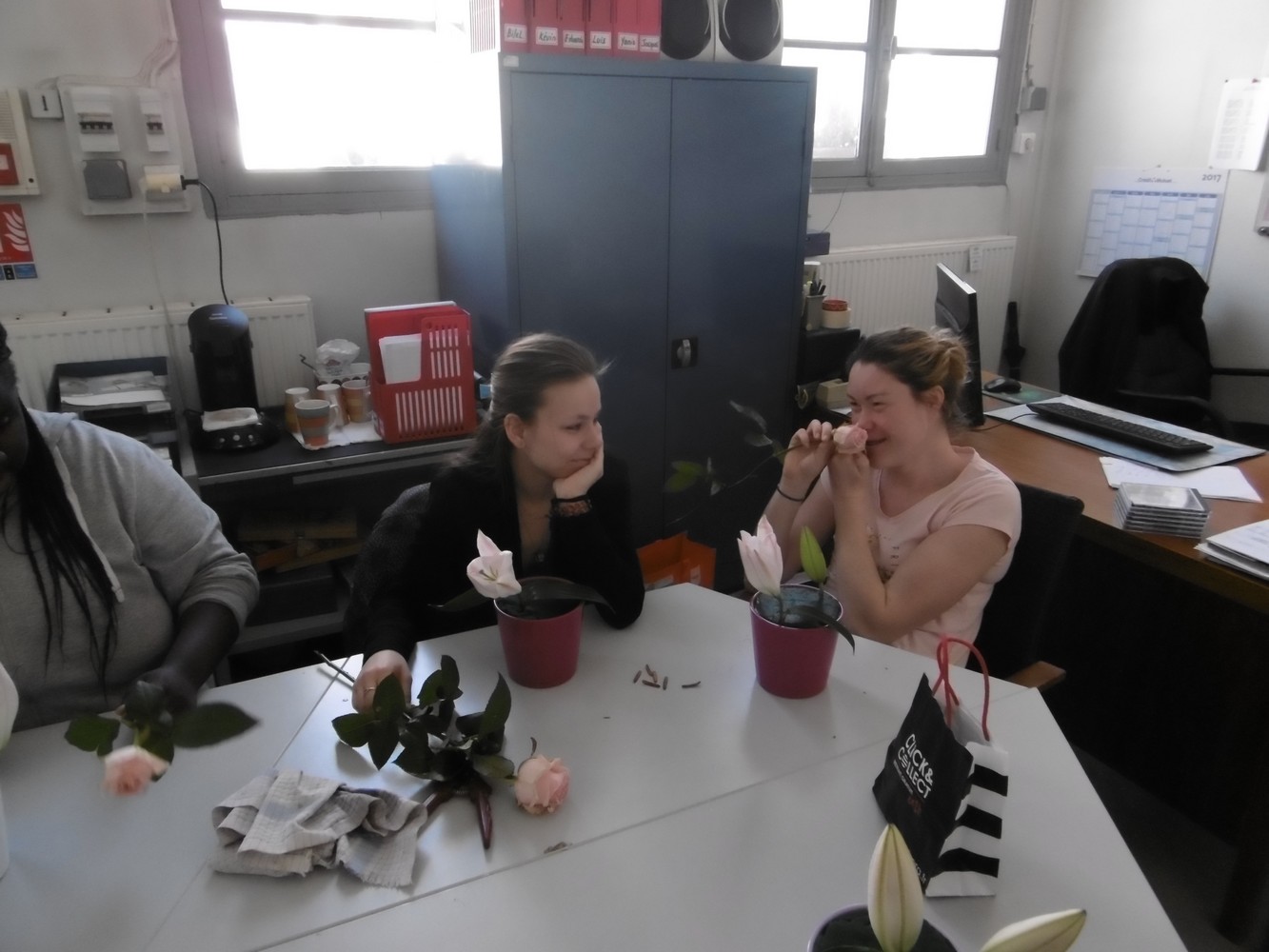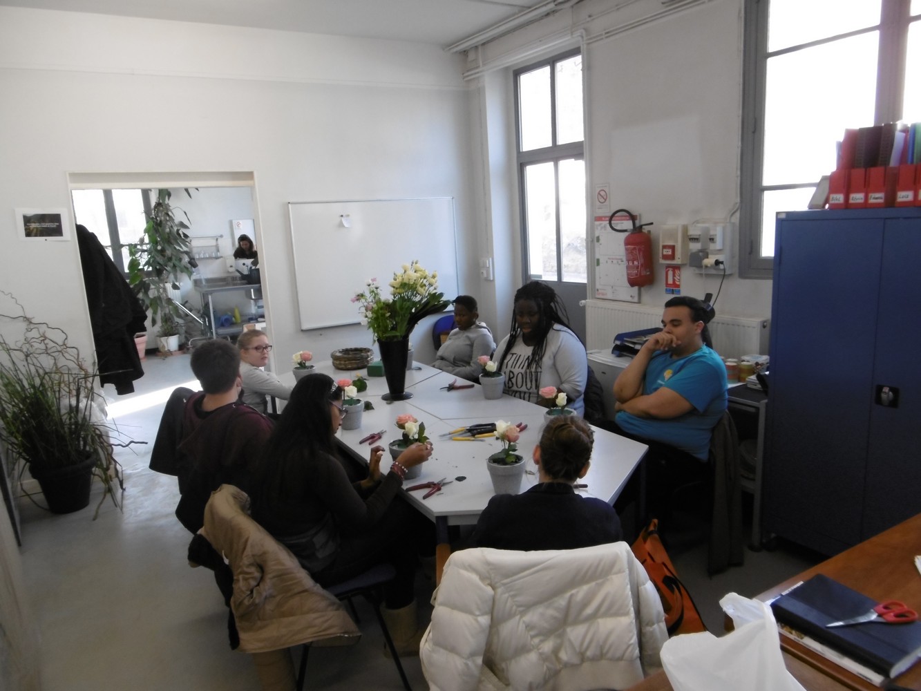 Mme Perrine GUYARD fleuriste (Aurythmedessaisons), anime avec un éducateur un atelier d’Art Floral auprès d’un groupe de jeunes sur les temps des samedis d’ouverture de l’établissement.