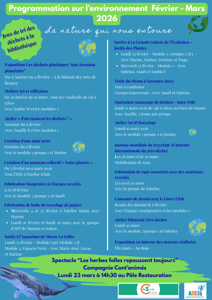 De février à mars 2026, l’IME Les Vallées met en place une programmation artistique et culturelle consacrée à la thématique de l’environnement, dans le cadre du label Culture & Santé.